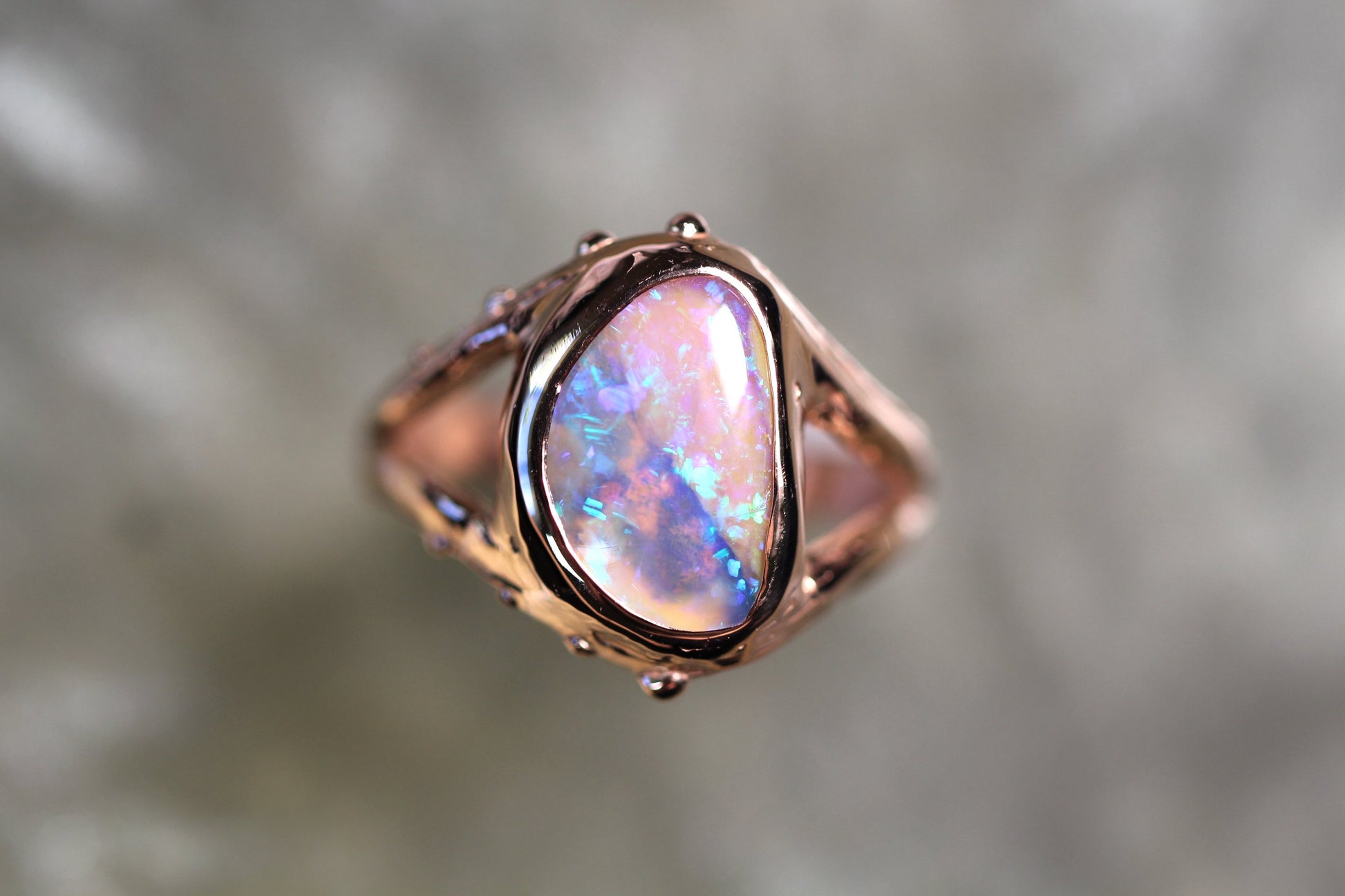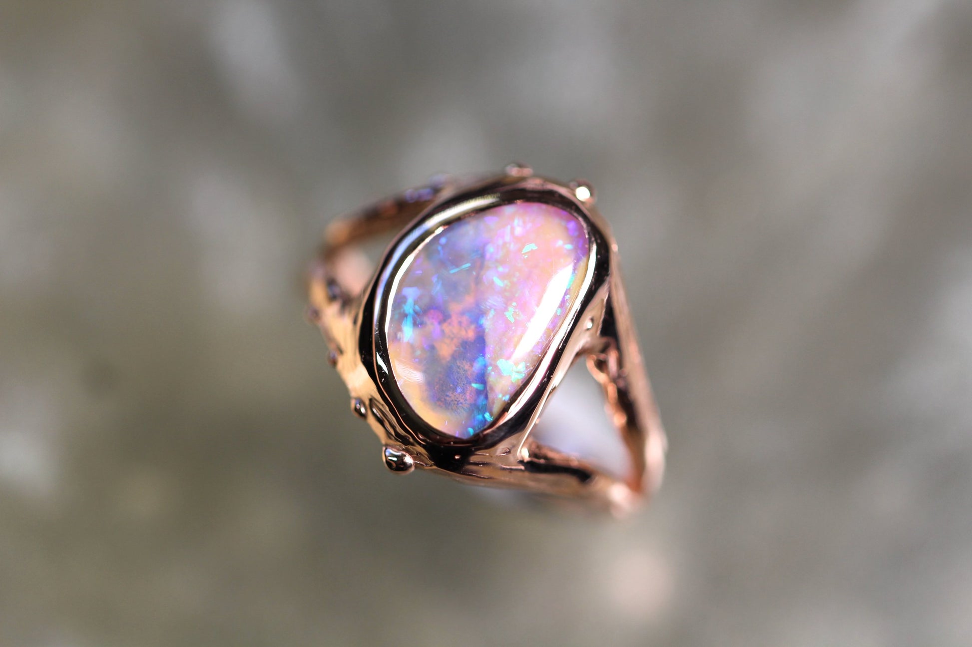 This Boulder Opal and Solid 9ct Rose Gold ring was made by Australian Jeweller and Opal cutter Chloe Fraser.