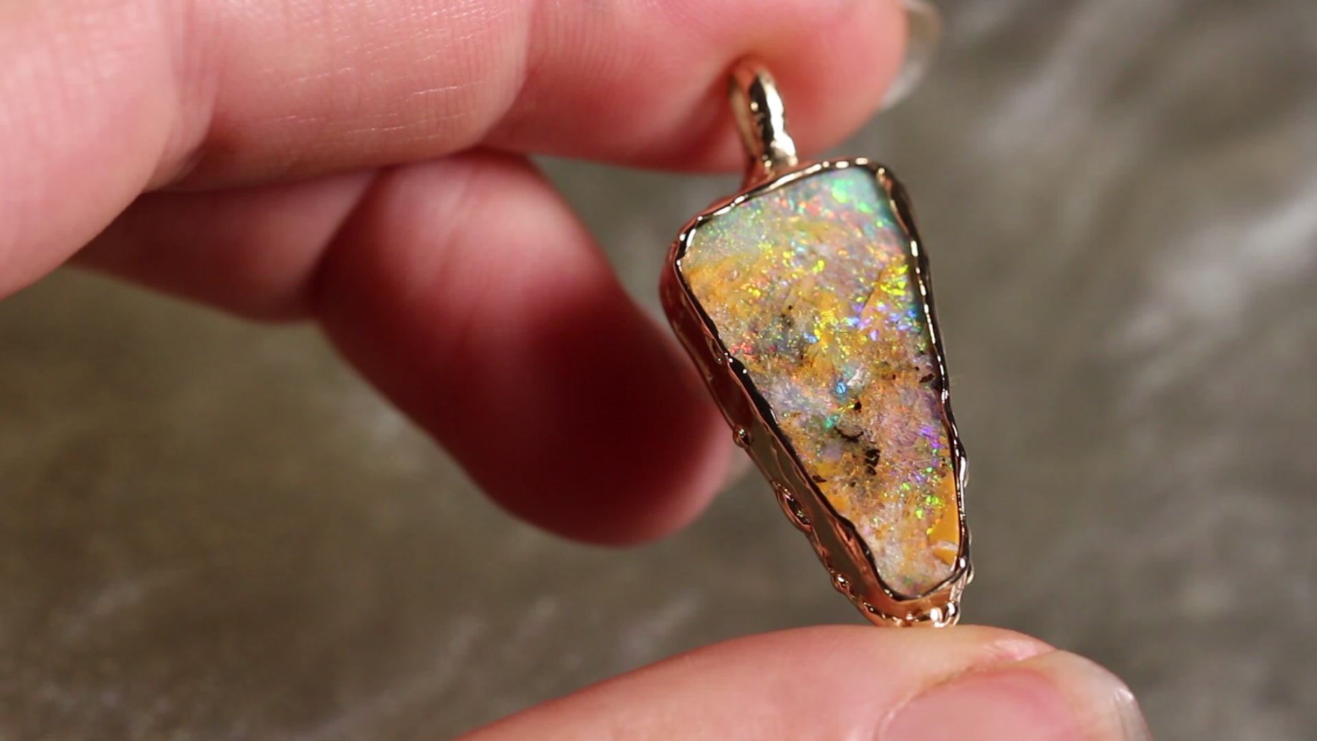 This Boulder Opal and Solid 9ct Yellow Gold Pendant was made by Australian Jeweller and Opal cutter Chloe Fraser.