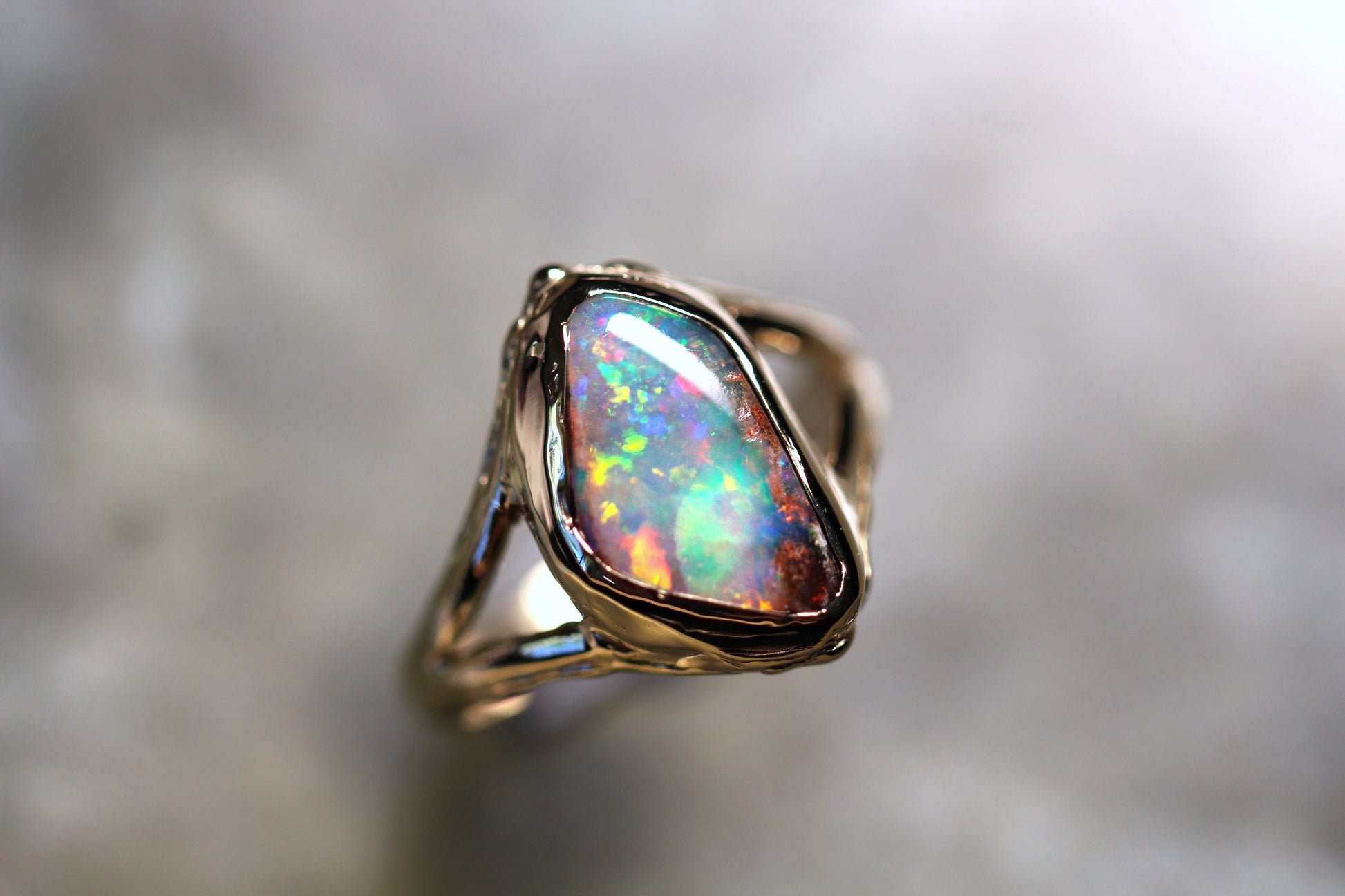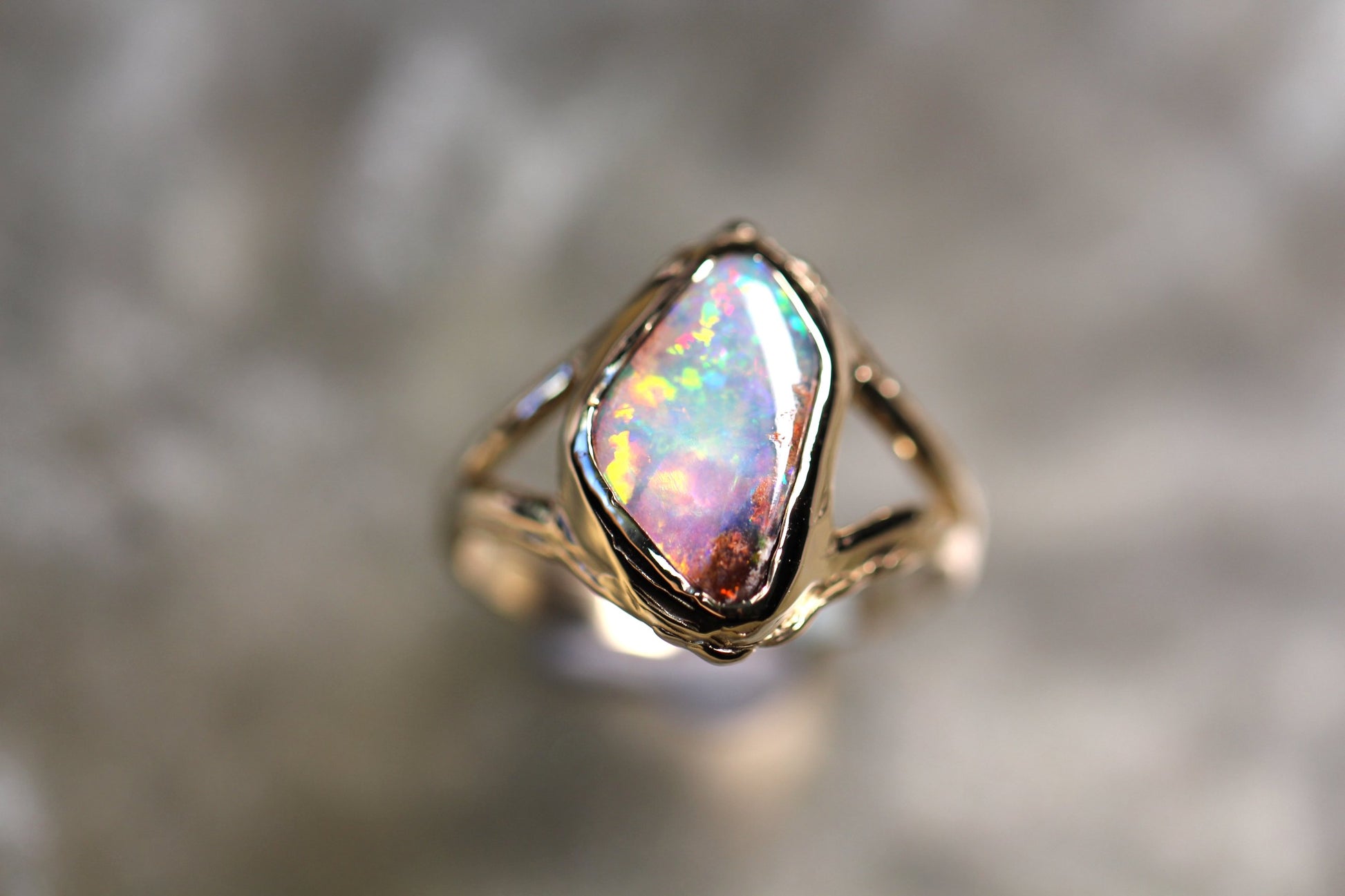 This Boulder Opal and Solid 9ct Yellow Gold ring was made by Australian Jeweller and Opal cutter Chloe Fraser.