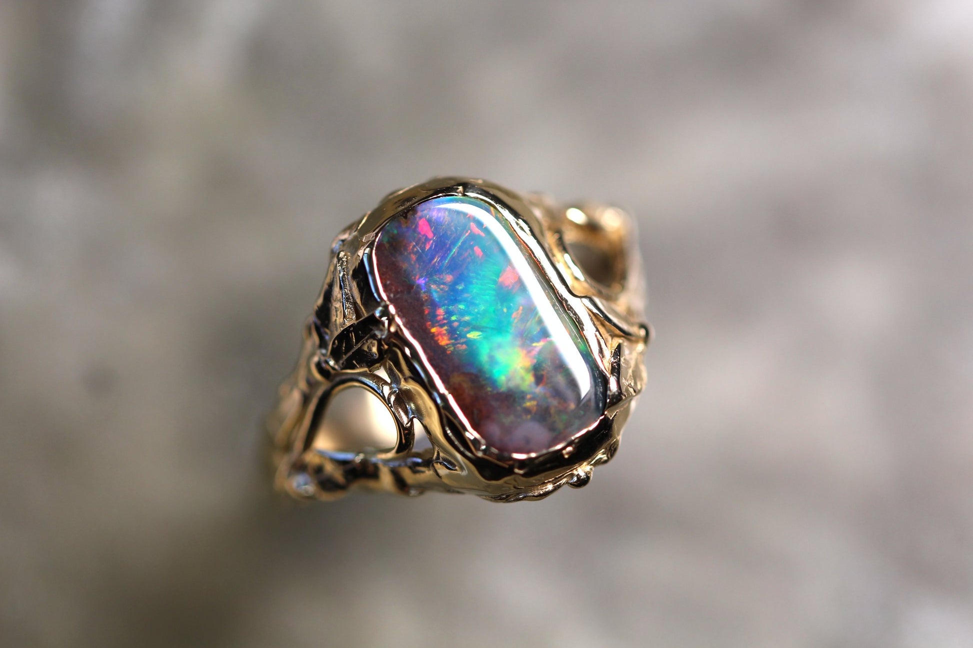 This Boulder Opal and Solid 9ct Yellow Gold ring was made by Australian Jeweller and Opal cutter Chloe Fraser.