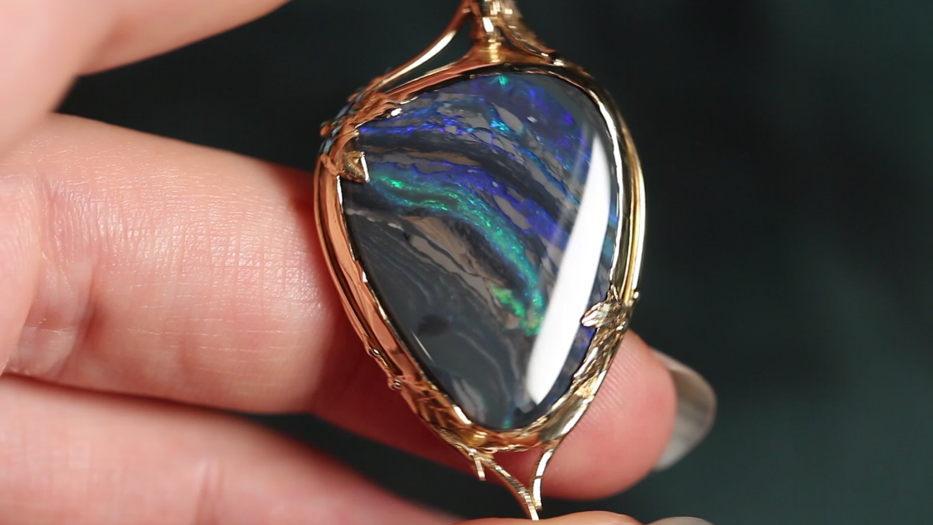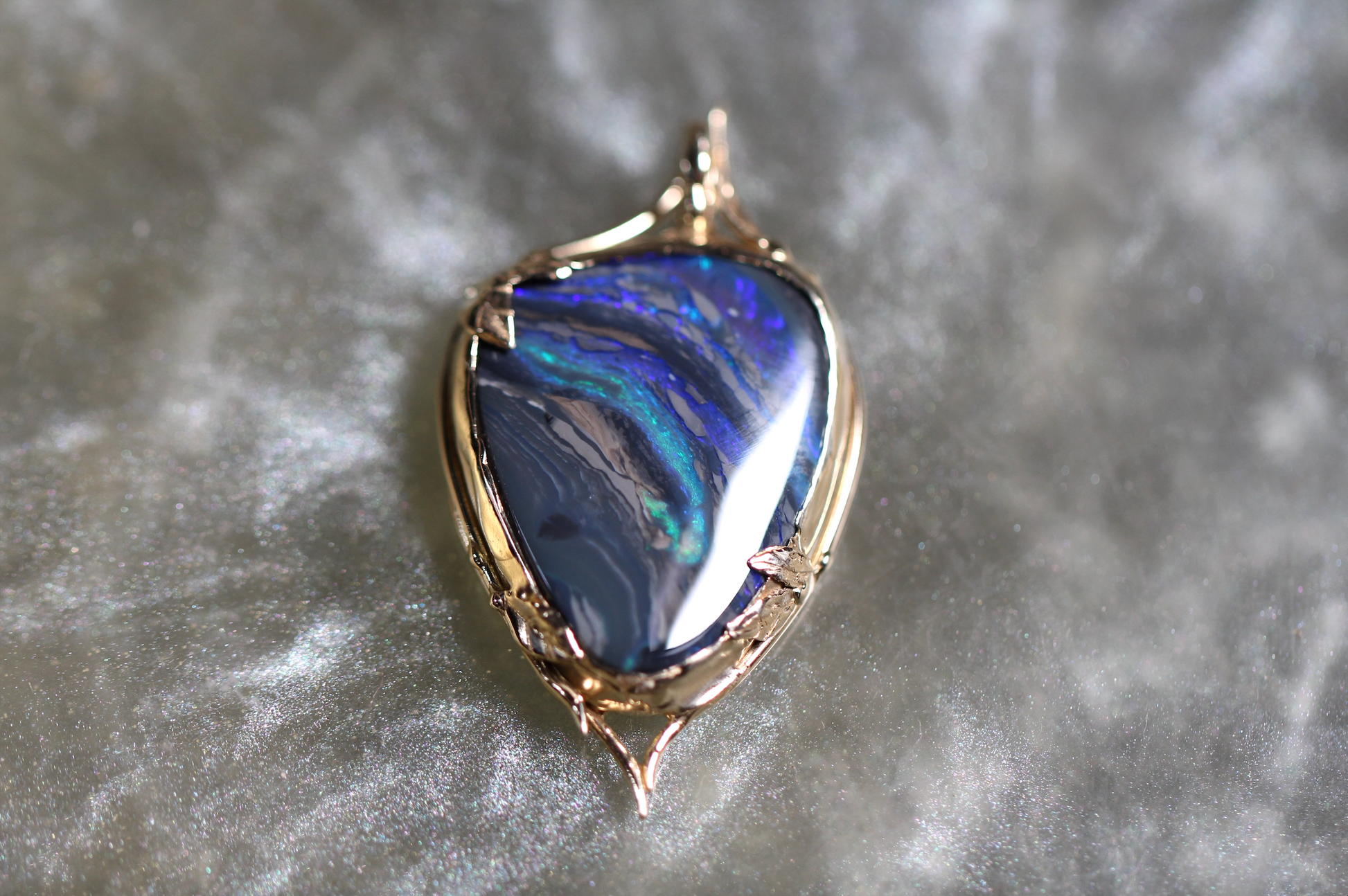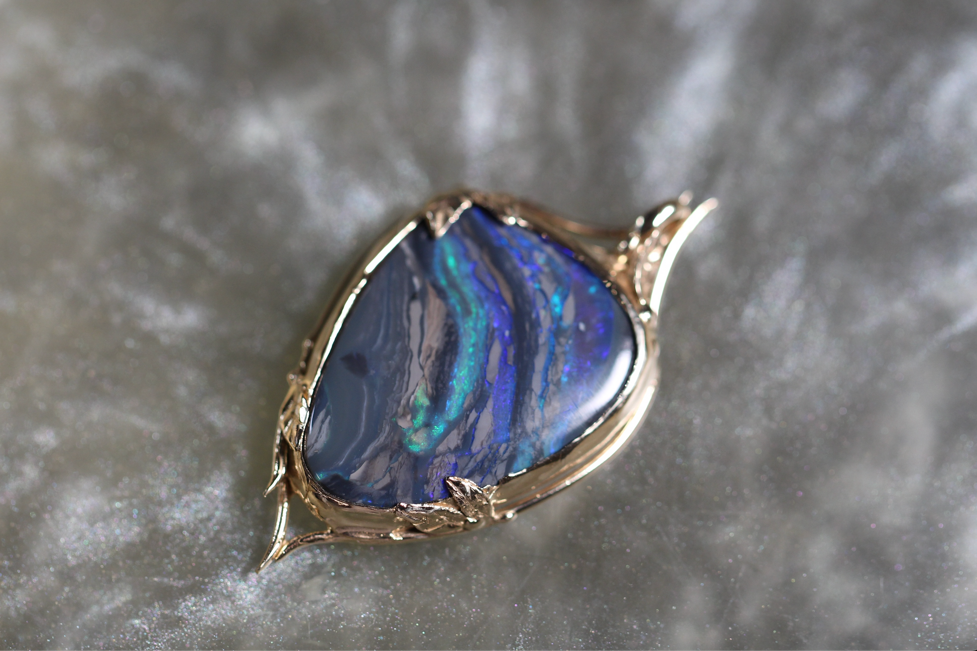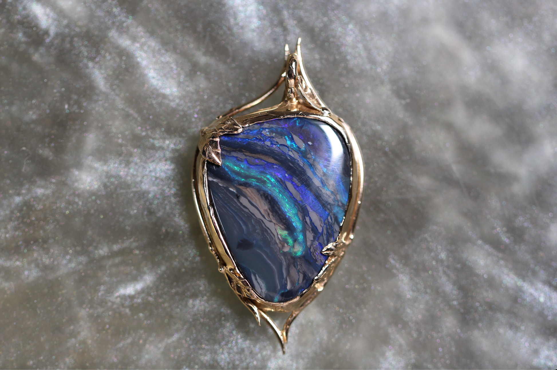 This Black Opal and Solid 9ct Yellow Gold Pendant was made by Australian Jeweller and Opal cutter Chloe Fraser.