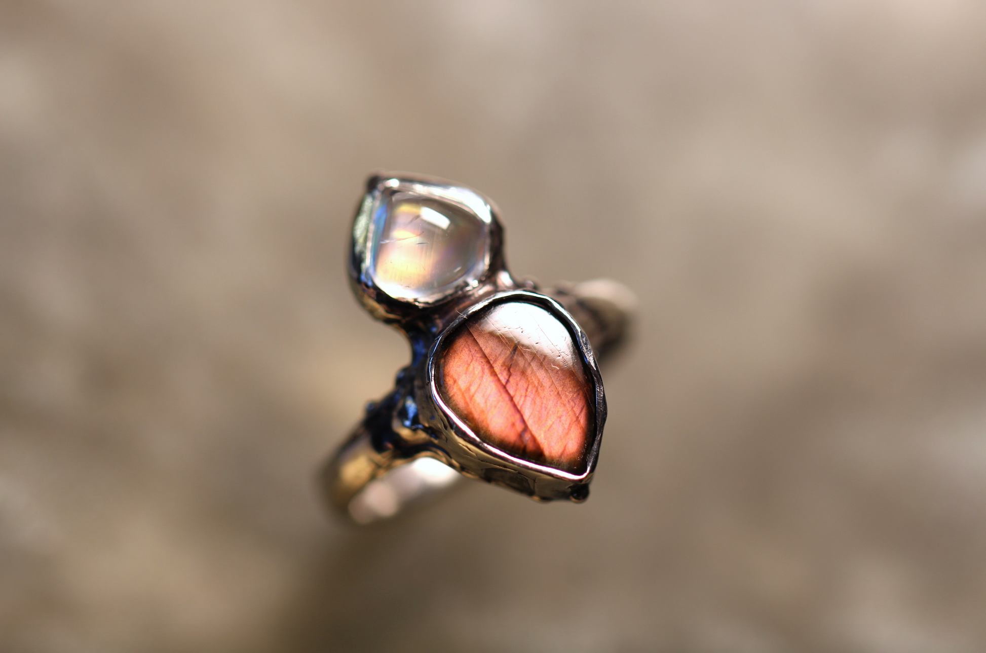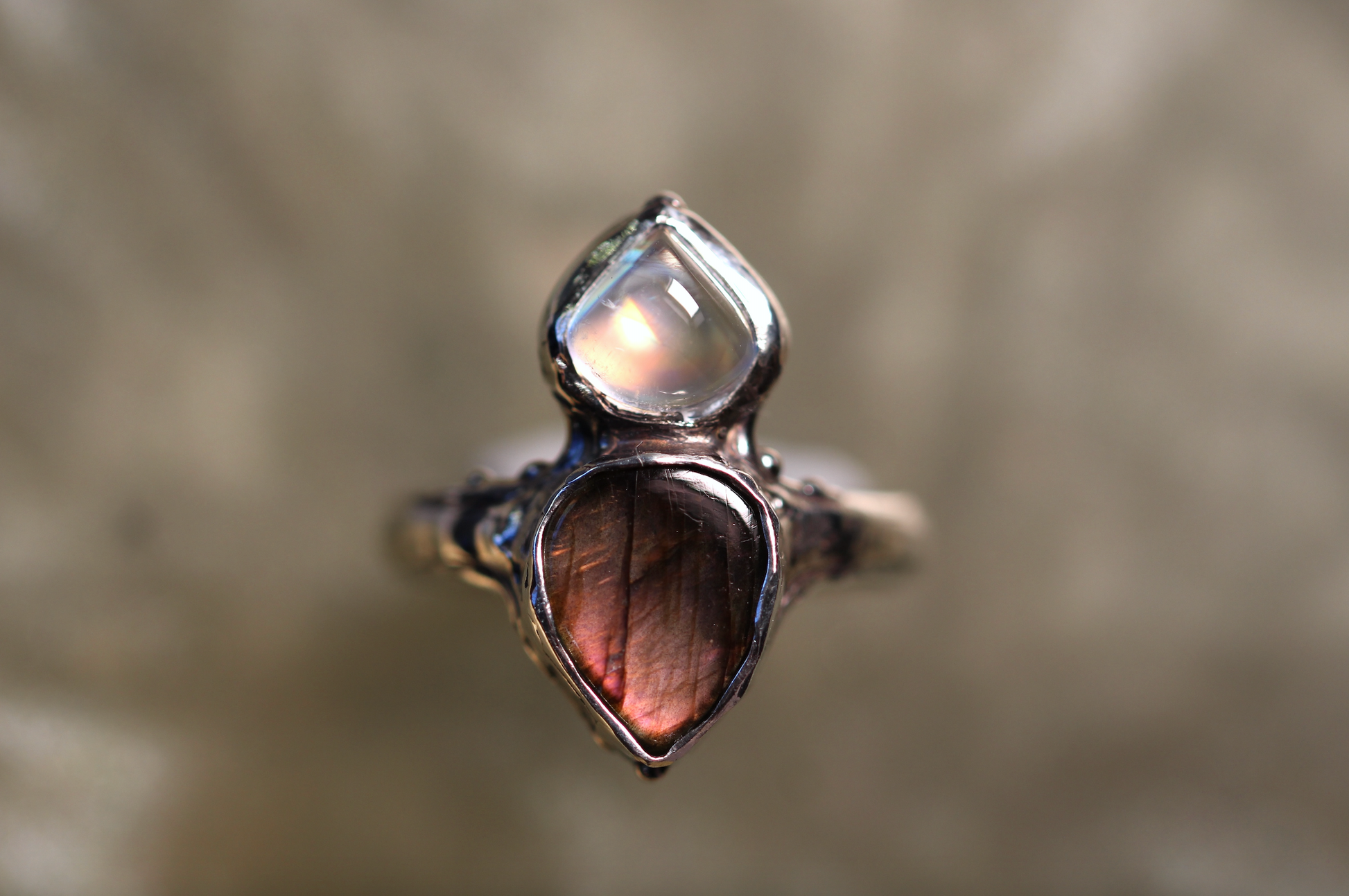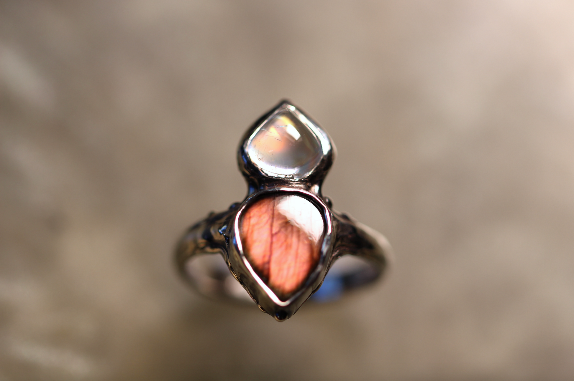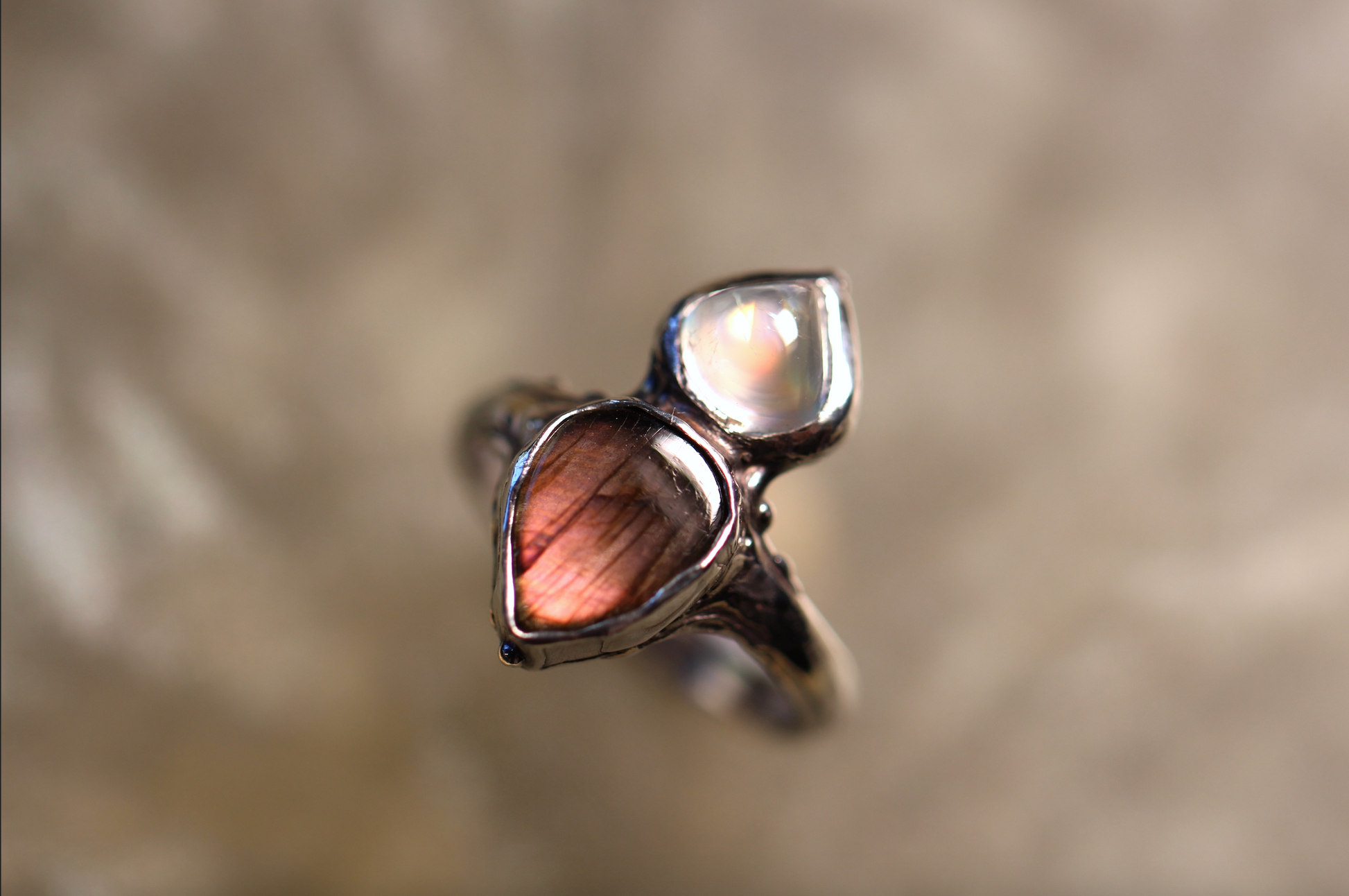 This Moonstone, Labradoite and Sterling Silver ring was made by Australian Jeweller and Opal cutter Chloe Fraser.
